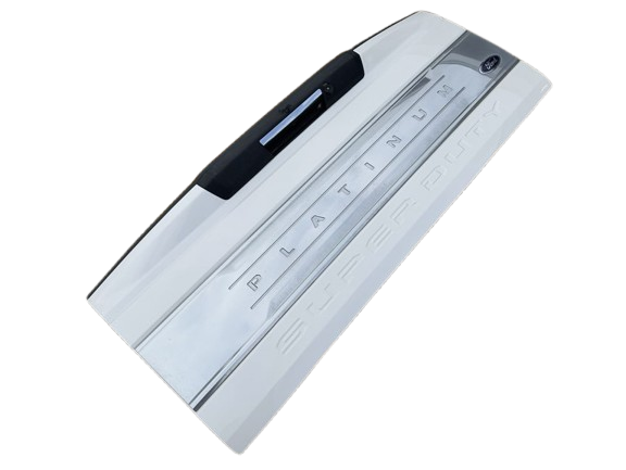 Factory Platinum tailgate step and camera for 2017-2019 Ford F250 and F350 trucks in Platinum White. This premium accessory enhances both functionality and style, making it an ideal addition to your truck.