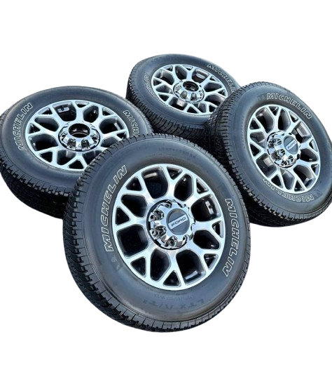 A set of brand new 20″ King Ranch rims mounted and balanced on LT275/65R20 Michelin tires, designed for Ford F250 and F350 models. This stylish wheel and tire combo is perfect for enhancing both the performance and appearance of your truck.