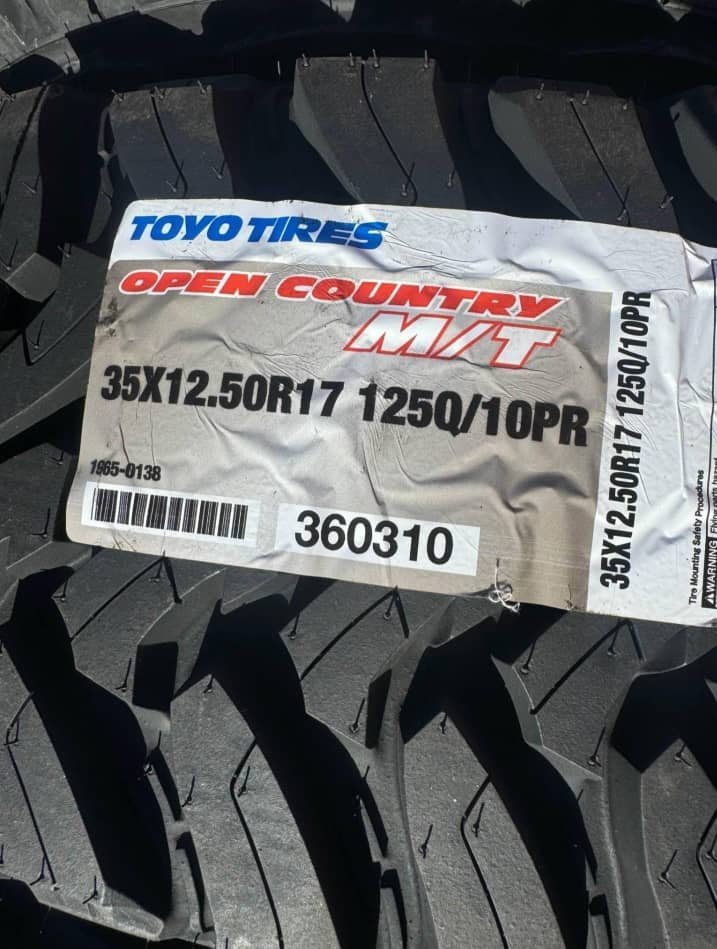 A set of 4 Toyo Open Country MTs (Mud-Terrain) tires, size 35/12.50/17. These tires are brand new and stickered, with a manufacture date of the 35th week of 2024. Designed for off-road performance, they come with a Load Range E rating for enhanced durability.